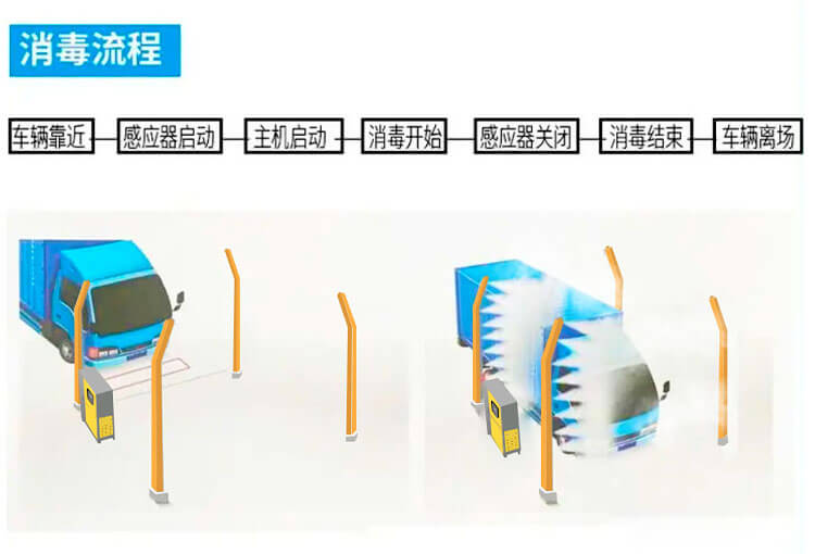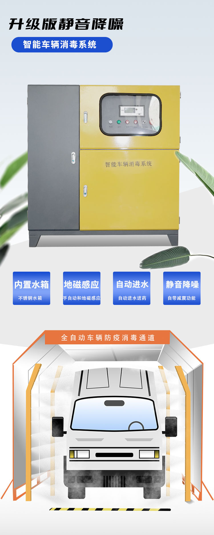 車輛消毒通道是一種通過地面嵌入式電子頻感傳感系統(tǒng)對通過通道的車輛進(jìn)行感應(yīng)識別,并智能化啟動動力系統(tǒng)對進(jìn)入通道內(nèi)的車輛進(jìn)行消毒的系統(tǒng)設(shè)備。車輛消毒通道設(shè)備可智能工作,實現(xiàn)無人值守工作。整個系統(tǒng)可以自動按比例加藥,自動控水加水;車輛進(jìn)入時自動識別及設(shè)備自動啟動,消毒完畢后自動關(guān)閉,車輛出去時可智能識別并禁止設(shè)備工作,實現(xiàn)單向消毒;當(dāng)室外溫度低于安全溫度時自動啟動加熱防凍系統(tǒng),對噴霧系統(tǒng)進(jìn)行恒溫加熱控溫保護(hù)。設(shè)備消毒模式:設(shè)備啟動后動力主機工作并通過高壓噴霧系統(tǒng)在通道房內(nèi)形成立體霧墻,車輛在霧墻內(nèi)運行過程中對整車實現(xiàn)動態(tài)的,徹底的消毒。