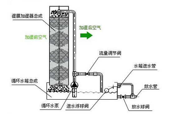 空調(diào)機(jī)組加濕,是通過(guò)水箱中的水輸送到加濕器頂部的淋水器,水均勻地淋到濕膜的頂部,淋水器確保水均勻分配到濕膜材料上,水在重力作用下沿濕膜材料向下浸透,淋濕濕膜內(nèi)部的所有層面,同時(shí)被濕膜材料吸收,形成均勻的水膜.當(dāng)干燥的風(fēng)通過(guò)濕膜材料時(shí),干燥的空氣和濕潤(rùn)的濕膜表面有較大面積的接觸,水份充分吸收空氣的熱量而汽化、蒸發(fā),從而達(dá)到對(duì)空氣加濕的目的。在這一加濕過(guò)程中,空氣的濕度增加,溫度下降,但空氣的焓值不變。