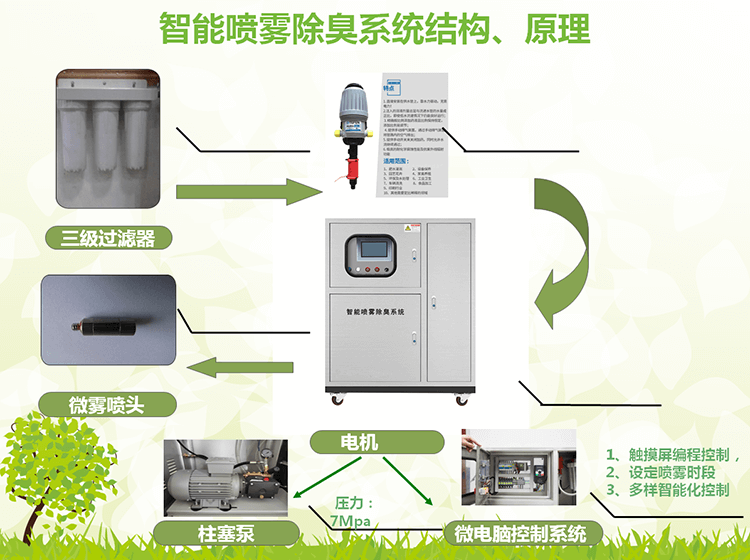 將經(jīng)過三級(jí)5um水過濾凈化處理的水,流經(jīng)自動(dòng)等比例加藥器、根據(jù)使用要求稀釋后,進(jìn)入混合藥箱、柱塞泵將凈化稀釋過的藥水加壓5-7MPa,通過高壓管道,傳送至反濺式自鎖微霧噴頭,經(jīng)噴嘴內(nèi)部渦流旋桿高速霧化后,經(jīng)3-5um微霧向空間噴射,微霧在空間中迅速由液態(tài)變成氣態(tài),彌漫整個(gè)空間,和臭氣分子接觸分解或吸附,消除空間內(nèi)的異味、殺菌、消毒、創(chuàng)造宜人的現(xiàn)場(chǎng)環(huán)境。