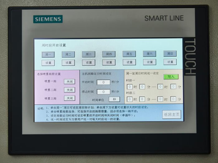 還可以選工作當(dāng)天的任意時(shí)段工作或不工作(如午休或下班),可以連續(xù)設(shè)置16個(gè)工作時(shí)段;工作時(shí)段內(nèi)可以選擇噴霧5秒~60分鐘,也可同時(shí)設(shè)置停止噴霧的間隔時(shí)間5秒~60鐘,比如設(shè)置為開20秒停20分鐘…..